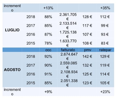 Il primo dato interessante è quello sull’occupazione media. I tassi di occupazione sono incrementati dal 46% nel 2014 al 63% nel 2017 con un trend positivo anche per il 2018, dove, nei mesi di punta, Luglio e Agosto, si osserva un incremento dell’occupazione di 10pp per il mese di Luglio, dal 78% all’88% e di 7pp per il mese di agosto, da 85% di occupancy nel 2015 a 82% nel 2018; quindi anche un aumento del fatturato, del pmv, prezzo medio di vendita, e della ratepar, fatturato generato per camera disponibile.